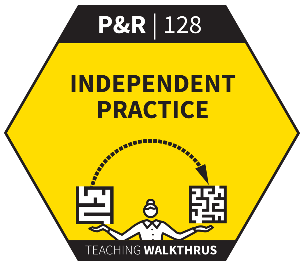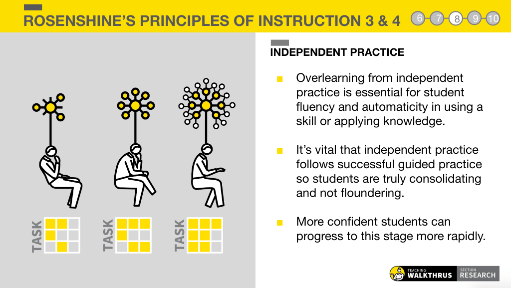 Overlearning from independent practice is essential for student fluency and automaticity in using a skill or applying knowledge. Fluency is an important element in learning as it frees up working memory. It’s vital that independent practice builds on successful guided practice so students are truly consolidating and not floundering. More confident students can progress to this stage more rapidly.